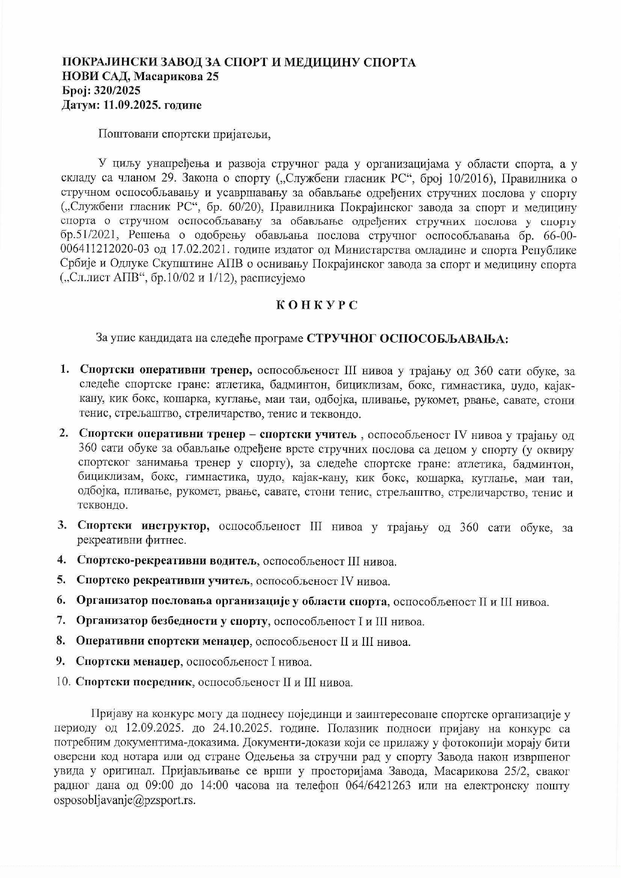 ДЕЛАТНОСТИ ПОКРАЈИНСКОГ ЗАВОДА ЗА СПОРТ И МЕДИЦИНУ СПОРТА МОЖЕТЕ ДА ПОГЛЕДАТЕ ОВДЕ:
